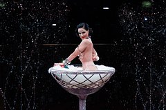 51-летняя знаменитость выступила перед публикой на показе Alexis Mabille в рамках Недели моды в Париже. Артистка появилась перед гостями топлес, позируя при всем этом в большенном бокале со стразами. Дополнительно она надела трусы-стринги, а обнаженную грудь прикрыла наклейками для сосков. Из аксессуаров на ней также были мощные колье и браслеты.